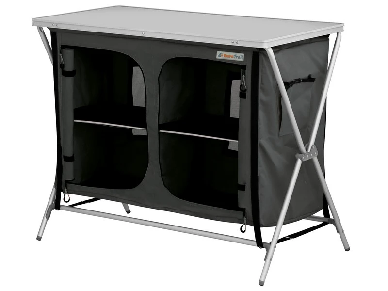 De campingkast is voorzien van handige top-plaat waar veel spullen op gezet kunnen worden. De etage planken zijn voorzien van een aluminium randje zodat deze niet gaan doorhangen. Door het vouw-frame is de kast heel eenvoudig op te zetten en weer op te bergen. De pootjes zijn verstelbaar zodat de kast stabiel neergezet kan worden. Inclusief handige opbergtas.
