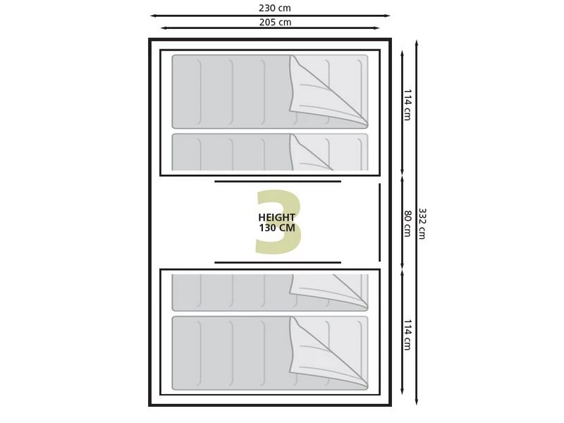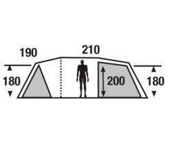 Ideale Vis-A-Vis tent met leefruimte tussen de 2 binnententen. De binnententen van de S-120 is geschikt voor 4 kinderen of 2 volwassenen met bagage, 2x 216 x 120 cm.