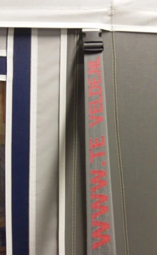 - Aan de voorzijde van de luifelzijwanden zijn klittenbandjes bevestigd, zodat de zijwand aan de staande stok zit bevestigd is.